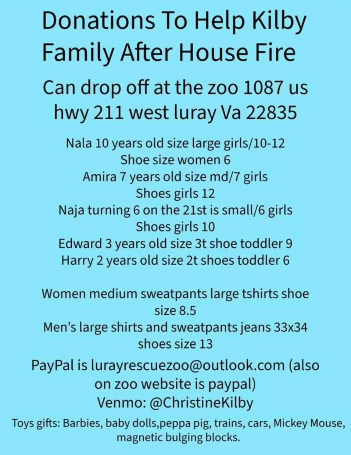 The Zoo is located at 1087 US-211, Luray, VA 22835. Monetary donations may be sent via check or via PayPal (lurayrescuezoo@outlook.com) or Venmo (@ChristineKilby).