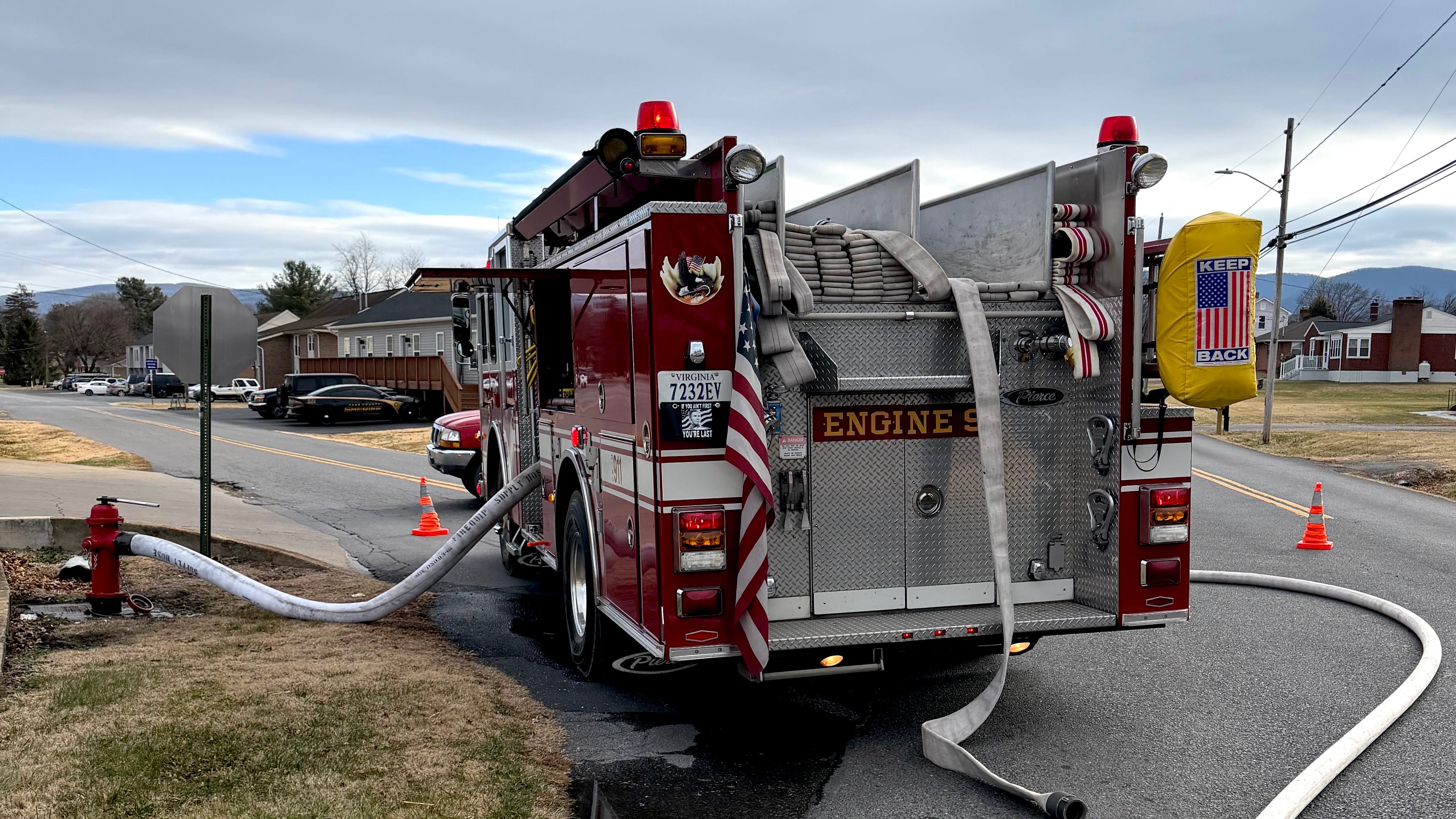 Engine 9 established a water supply by reverse-laying to a hydrant at the corner of Reservoir Avenue and Massanutten Avenue.