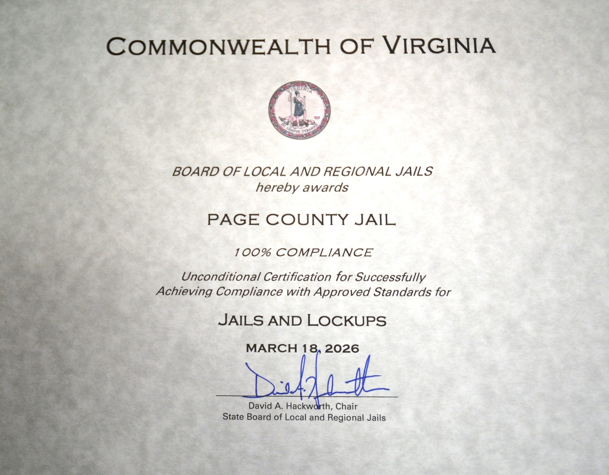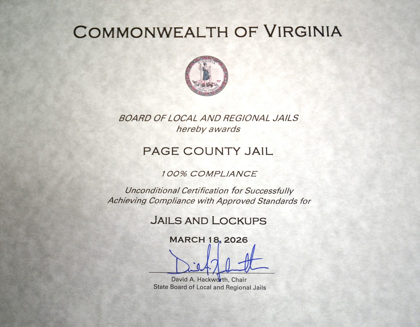 LURAY, Va. — The Page County Jail has received a 100% compliance certification from the Virginia Board of Local and Regional Jails, marking the 11th consecutive year the facility has met all required standards, according to the Page County Sheriff’s Office (PCSO).