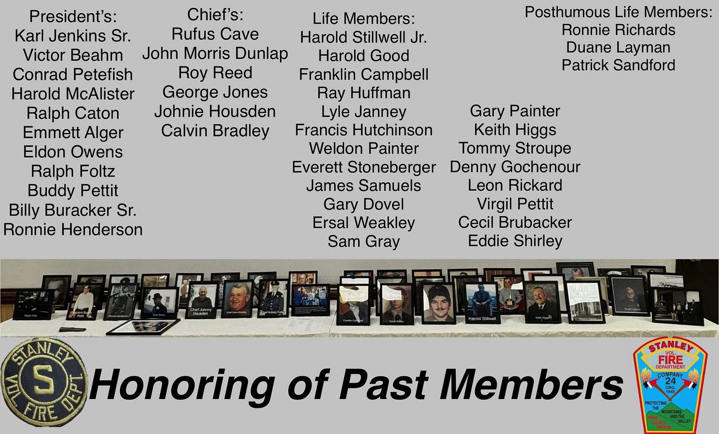 Thank you to ALL members of the Stanley Volunteer Fire Department CO.24 for your hard work and dedication to our department and community. Thank you to our community members for your support of our events and for your donations throughout the year!